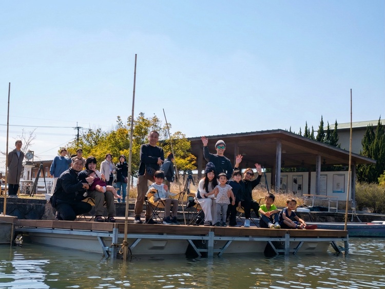 最大の魅力は、その使い勝手の良さにあります。実際に乗ってみると、いかだのように水面にぷかぷかと浮かぶ感覚を味わいながらも、驚くほどの安定感に包まれます。先日行われたお披露目会では、小さなお子さんたちも、まったく怖がることなく「掘床」にひょいと飛び乗り、おいしそうに焚き火でマシュマロを焼いて頬張る微笑ましい光景が見られました。また、夕方には同じ「掘床」の上に本格的な茶室がしつらえられ、水音を背景にお茶を嗜む風流なひとときが繰り広げられました。