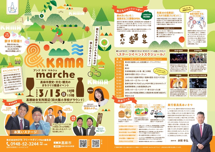 福岡県嘉麻市で、歴史・文化・観光のまちづくり推進イベント『&KAMA marche(アンド カマ マルシェ)』が、3月15日(日)に開催されます。会場となる嘉穂総合支所周辺(旧大隈小学校グラウンド)には、地元の人気店によるグルメや雑貨が大集合!ハンバーガーや熱々の唐揚げ、ケーキにとれたての地元野菜など、嘉麻市内の「おいしいもの」が勢ぞろいします。