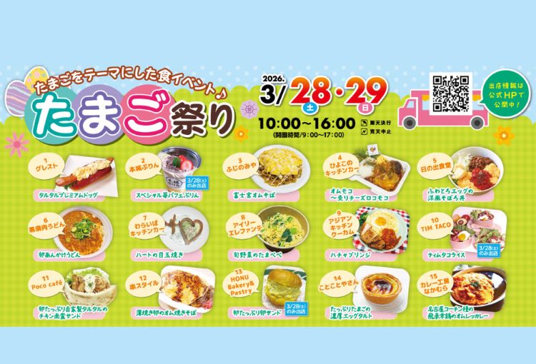 会場には、キッチンカーによる自慢のメニューが勢ぞろい。定番の「ふわとろオムライス」や「オムそば」はもちろん、自家製タルタルソースがたっぷりかかったチキン南蛮サンドやホットドッグなど、食欲をそそるラインアップ!中には、希少な名古屋コーチン種の卵を使った限定のオムレツカレーといった、こだわりの一皿も登場します。