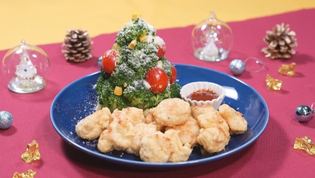 ②円錐状に成形して、皿に乗せ、解凍して水気を切ったブロッコリーを芋が隠れる程度に埋め込む
