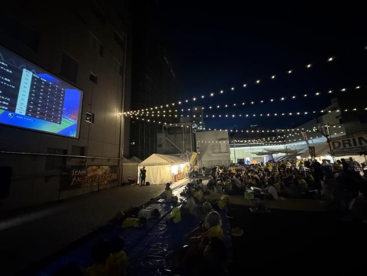 夜風が心地よくなってきた小倉の街、グルメやドリンクが並び、飲みながら食べながら、中には寝ころびながら、のんびり観戦されている方もいました。