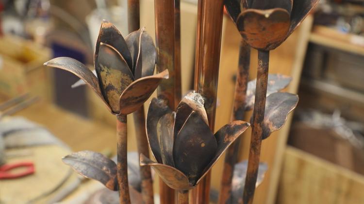 原さんのランプの土台は、鍛造、焼き入れ、溶接、彫金といった様々な加工を銅やステンレスに施すアートメタルという工芸品。