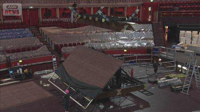 大相撲公演が行われるロイヤル・アルバート・ホールでは12日、伝統的な吊り屋根の設置作業や土俵に配置される俵の準備などが行われました。