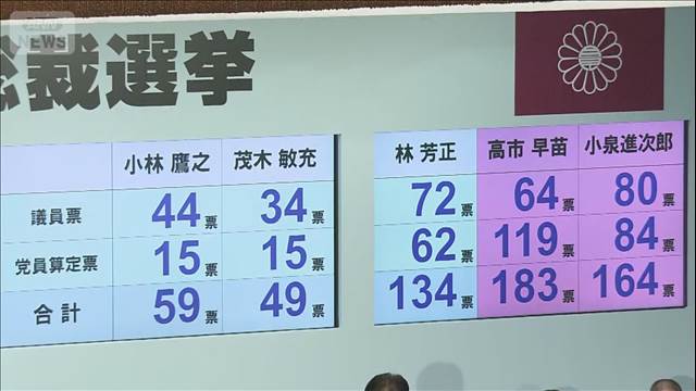 3位は林官房長官で議員票72票、党員票62票であわせて134票、4位は小林元経済安保担当大臣で議員票44票、党員票15票であわせて59票、5位は茂木前幹事長で議員票34票、党員票15票であわせて49票でした。