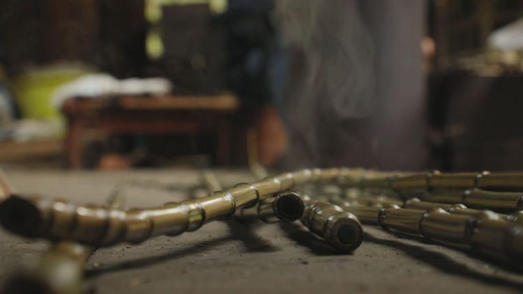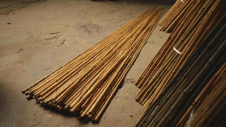 これは、後の工程で竹を火で炙る際に、内部の空気が膨張して竹が破裂するのを防ぐために、あらかじめ竹の節を抜く重要な準備です。