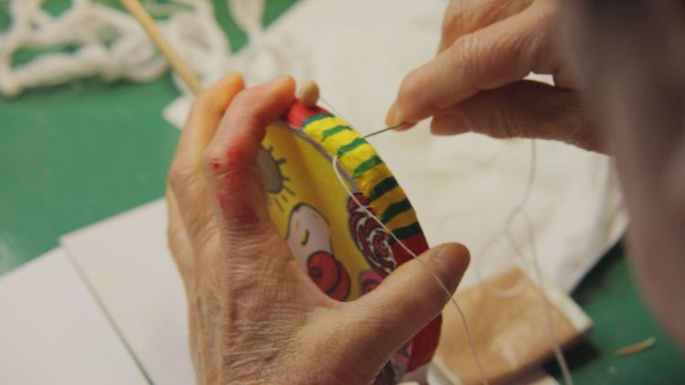 「ポンパチ」専用に漉いてもらった和紙を、輪にした竹にピンと張り、一つ一つ丁寧に絵付けをする。
