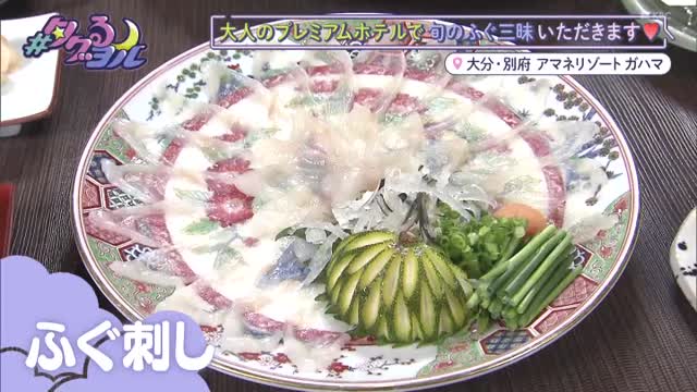 温泉で温まった後は、お待ちかねの夕食の時間。再びガハマに戻り、施設内にある「割烹 松秀」へ。ここでは、大分県産の食材を中心に、生簀から揚げたばかりの新鮮な魚介類を使った日本料理がいただけます。今回は、旬を迎えた大分・臼杵産のとらふぐを使った、全8品の豪華な会席料理を堪能します