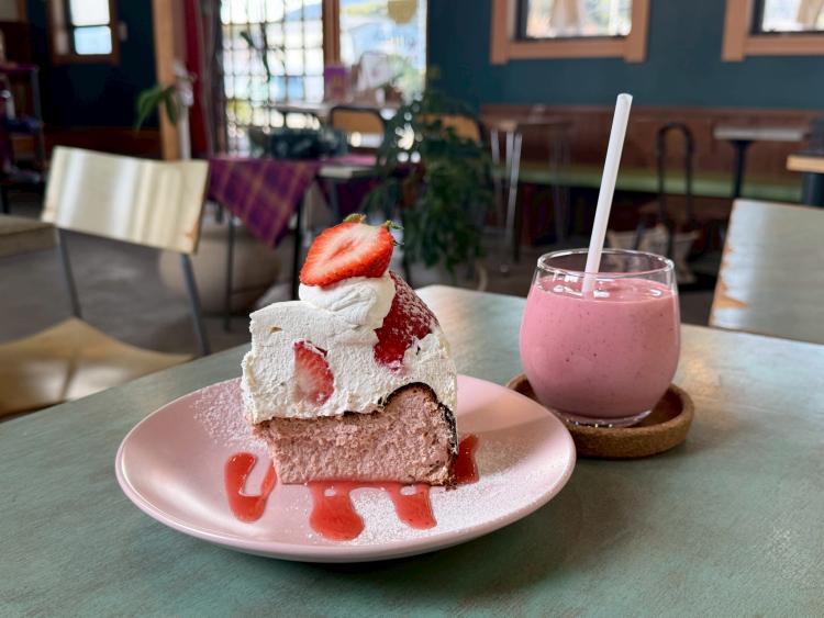 おススメは「いちごのシフォン」。イチゴを練り込んだほんのりピンク色の生地に、生クリームをサンドしています。「見た目(の印象)よりも、数倍濃いイチゴの味がします!おいしいです~」とカイラ君。他にもレモン、チョコレート、キャラメルなどのシフォンケーキや、季節のフルーツを使ったケーキなどが揃っています。