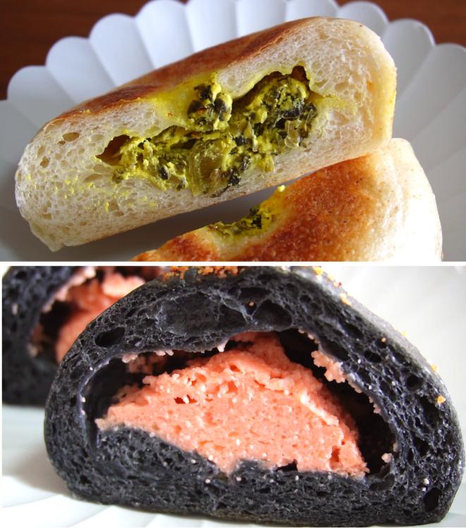 ほかにも、高菜漬けとクリームチーズを合わせたものや、竹炭を練り込んだ黒い生地で明太チーズを包んだものなど、個性豊かな総菜系ベーグルも揃っています。