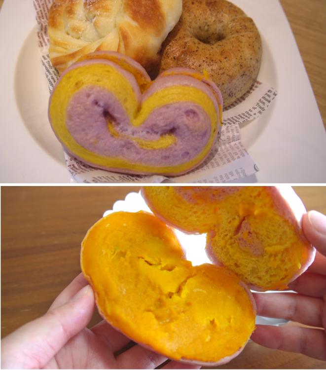 カボチャと紫イモを練り込んだマーブル模様の生地の中には、濃厚なカボチャクリームがたっぷり入っています。