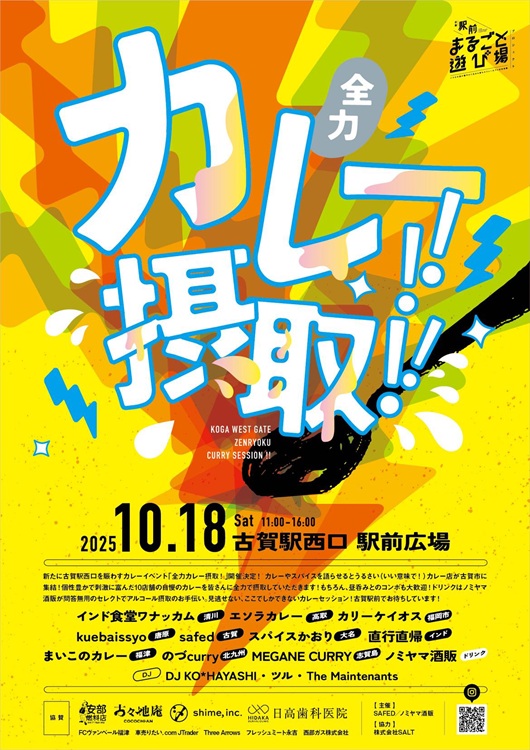 『全力カレー摂取!』は、10月18日(土)〜26日(日)の9日間にわたってJR古賀駅前で行われる『古賀駅前まるごと遊び場プロジェクト2025』の初日に開催。カレーイベント終了後の17時からは、毎年恒例の「土曜夜市」も行われるので、お楽しみに!