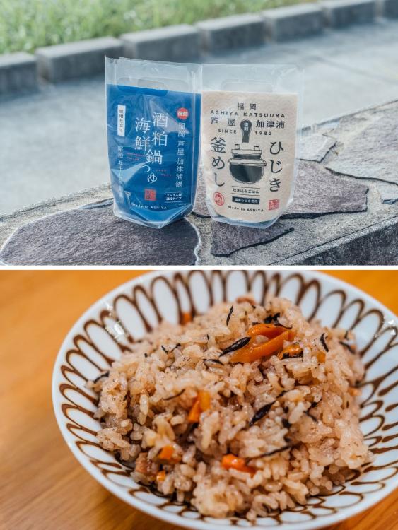 芦屋町特産のひじきを使った「ひじき釜めし」と、ブリのアラと味噌・酒粕をブレンドした「加津浦鍋」。4~5年前に瓶詰めで試作したが、衛生面の課題で断念。福岡県よろず支援センターや芦屋町の支援事業の協力を得て、1年以上かけてレトルト化に成功した。