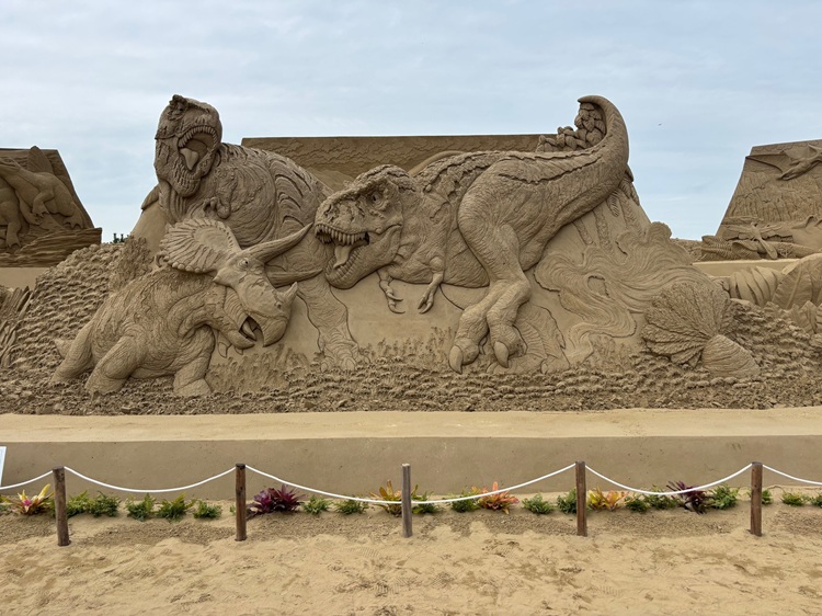 10回目となる今年のテーマは「時空を超えて~恐竜~」。イグアノドンの命名200年を記念し、ティラノサウルスやトリケラトプスなど迫力満点の恐竜たちが砂像となって、太古の世界へと誘います。その数28基!最大で高さ約6m、幅約10mにもなるダイナミックかつ繊細な技術が光る砂像作品が多数展示されます。