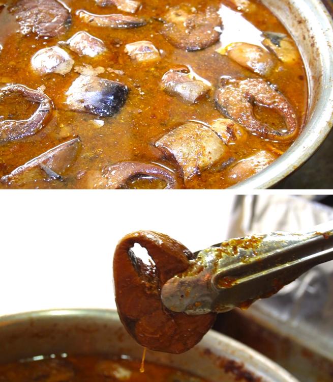 注文が入ると、鯖煮ととろみをつけた煮汁を鉄板で焼いていきます。