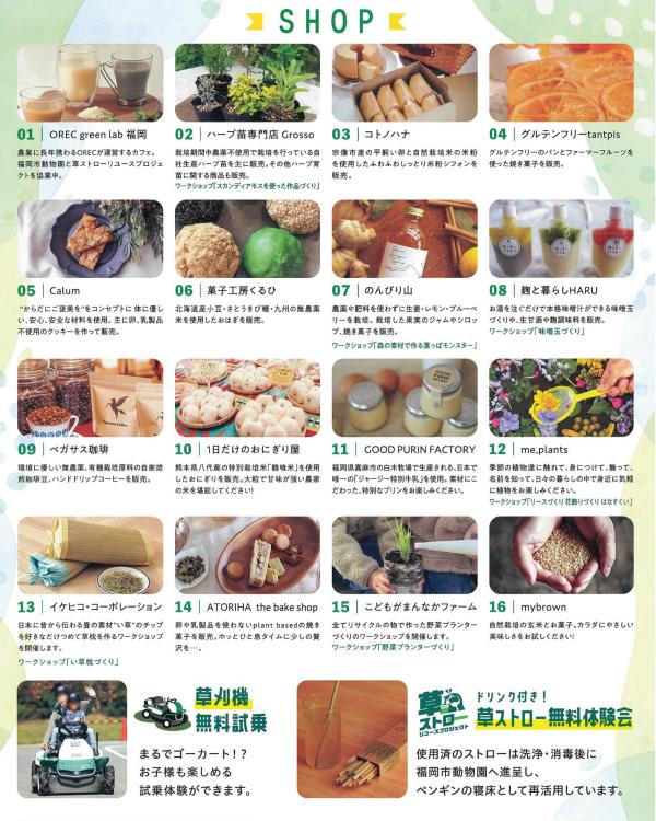 さらに会場では、『OREC green lab 福岡』が福岡市動物園と一緒に取り組んでいる「草ストローリユース」プロジェクトの紹介コーナーや、有機農法で活躍する草刈機の試乗体験なども行われ、より良い環境や社会に向けて作られた商品の魅力を存分に味わうことができます。