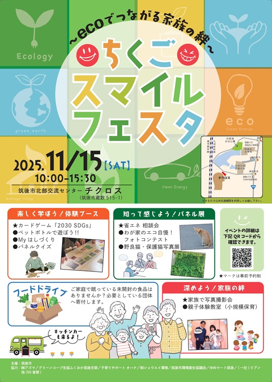 11月15日(土)に筑後市で開催される『ちくごスマイルフェスタ~ecoでつながる家族の絆~』は、エコな暮らしを楽しく学んで体験できるイベントです!