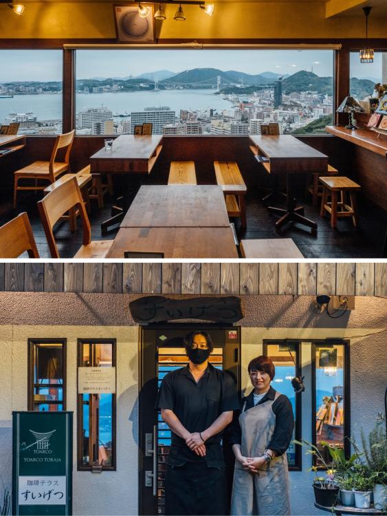 風師山の中腹、坂道を登り続けた先に現れる『珈琲テラス すいげつ』。扉を開けた瞬間、目の前に広がるのは関門海峡の大パノラマだ。昭和47年(1972年)の創業から53年、この絶景とともに歩んできた老舗喫茶店は今、三代目オーナー・河本真由美さんの手によって、新たな物語を紡ぎ始めている。