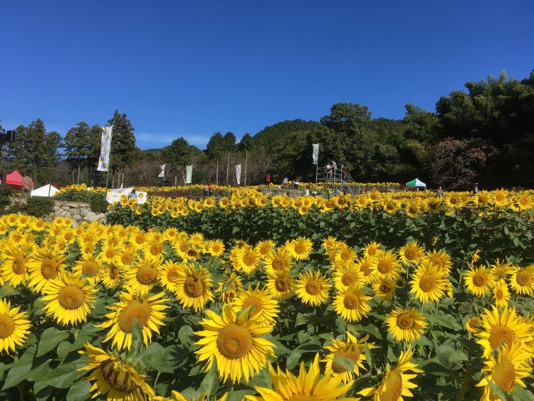 『山田ひまわり園』の魅力は、なんといってもそのロケーション!昔ながらの石積みの棚田一面に咲き誇る約10万本のヒマワリと、背景に広がる鷹取山の豊かな自然。遊歩道や展望台もあり、いろんな角度からヒマワリが咲く秋の風景を眺めることができます。
