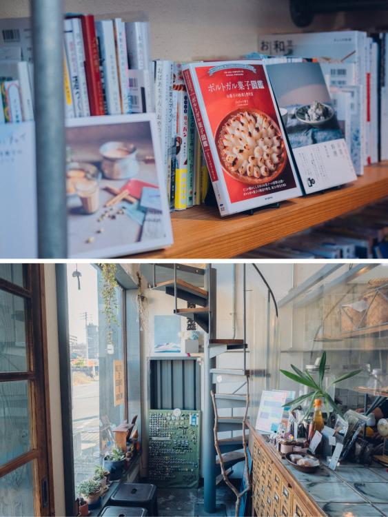 元々2階建てだった建物の天井を抜き、開放的な空間を創出。内装には農家からもらった古いタンスの引き出しを棚として再利用したり、図書館で廃棄予定だったカードケースをディスプレイに使ったりと、古道具を積極的に活用している。着台に足をつけてテーブルを作り、のれんも自身で染めた。