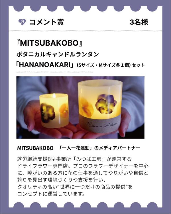 「コメント賞」では、一人一花メディアパートナー『MITSUBAKOBO(ミツバコウボウ)』の幻想的なボタニカルキャンドルランタンが3名にプレゼントされます!