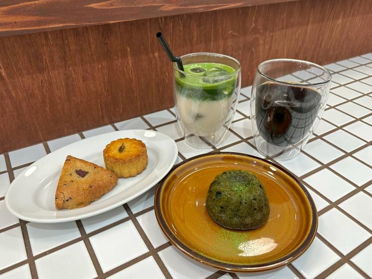 今回注文したのは「かぼちゃスコーン」(480円税込)、「大学いもスコーン」(460円税込)、「抹茶の豆腐ブラウニー」(720円税込)、そして「八女抹茶オーツラテ」(680円税込)。