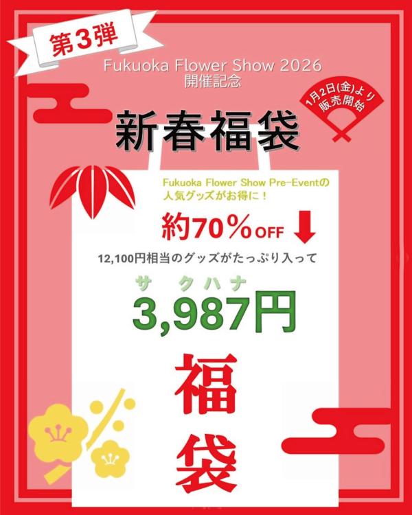 福岡市植物園ショップ『おやすみ山』では、『Fukuoka Flower Show 2026』の開催を記念して、『Fukuoka Flower Show Pre-Event』の人気グッズを集めたお得な福袋の第3弾「新春福袋」を1月2日(金)から販売開始!