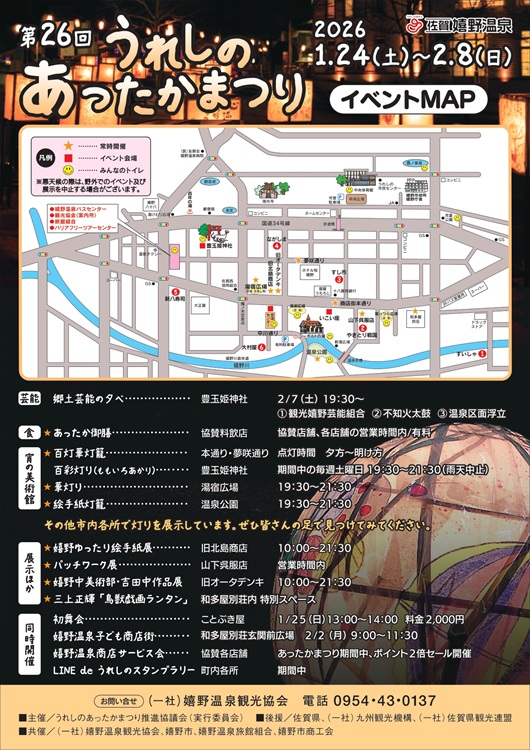 日本三大美肌の湯・嬉野温泉で、1月24日(土)から恒例の『第26回うれしのあったかまつり』がスタートします 。
