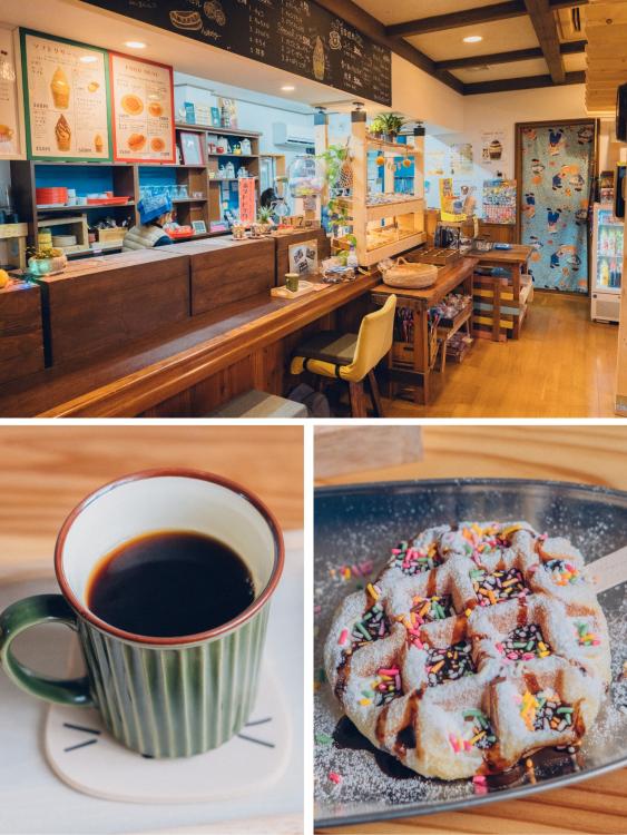 靴を脱いで店内に入ると、左手には無添加スイーツを販売する『Kanade's Kitchen』。焼きたてワッフルやソフトクリームなど、手作りのカフェメニューが並びます。
