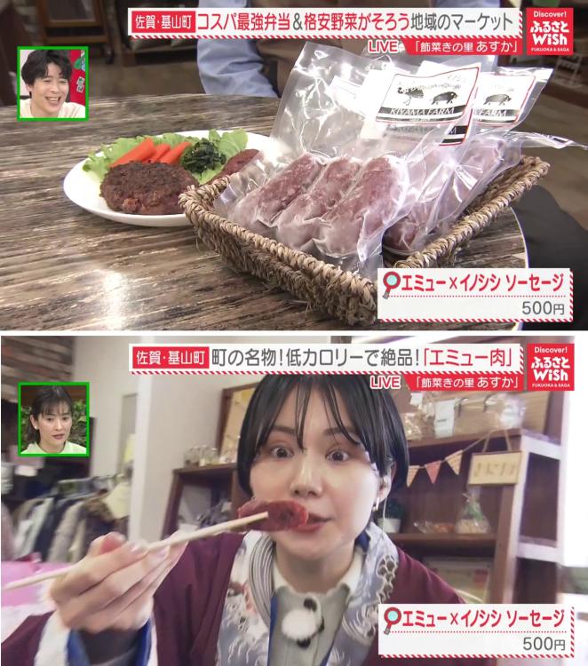さらに、基山町の名物「エミュー」の肉を使った「エミュー×イノシシ ソーセージ」(500円)もオススメ。