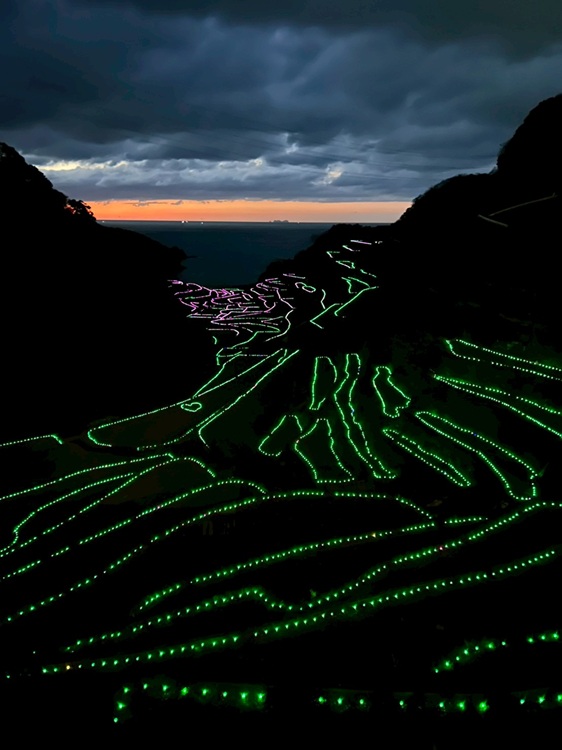 海へと続く美しい棚田が、LEDの優しい光で彩られる幻想的な光景。日没から約4時間点灯され、夜の棚田に浮かび上がる光の階段は息をのむ美しさです。