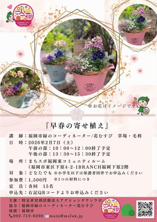 2月7日(土)福岡市東区の「まちスポ福岡東コミュニティルーム」にて、福岡市の緑のコーディネーターとして活躍している「花むすび」のお二人による「早春の寄せ植え」ワークショップが開催されます。