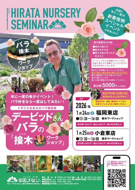 2026年で創業50周年を迎えた、福岡市一人一花運動のサポート企業でもある『平田ナーセリー』では、今週末と来週末にかけて、全国的に有名な講師を招いた講習会やワークショップが開催されます。
