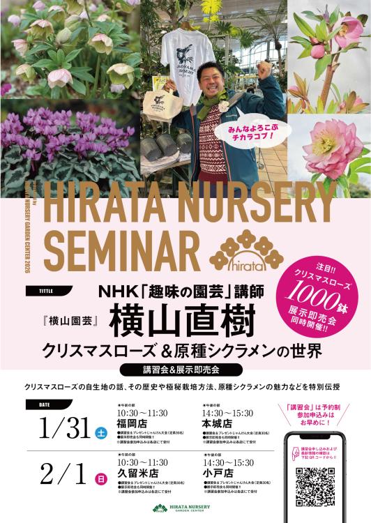 さらに、1月31日(土)、2月1日(日)には、クリスマスローズや原種シクラメンの育種家として世界的に有名で、テレビ・雑誌など各種メディアで大活躍している人気園芸家「横山園芸」横山直樹さんによる講習会「クリスマスローズ&原種シクラメンの世界」が開催されます。