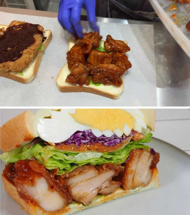 食パンの端まで甘辛いヤンニョムチキンを敷き詰めた、店内で最もボリュームのあるサンドイッチ。3種類の野菜と卵も加わり、彩りも鮮やかです。