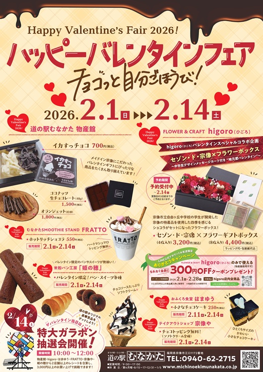 週末の買い出しでにぎわう「道の駅むなかた」が、2月14日(土)まで開催中の『ハッピーバレンタインフェア』で華やいでいます!新鮮な魚介はもちろん、この時期はチョコレートにも注目が集まります。