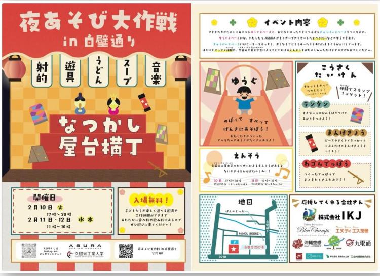 白壁交流広場では、久留米工業大学の学生が企画した『なつかし屋台横丁』が2月10日(火)から12日(木)までオープン!子どもたち用の遊具スペースには、大学生が手作りしたすべり台などの遊具がたくさん並び、万華鏡やランタン、輪ゴム鉄砲の工作体験(100円~)ができます。大人向けの休憩スペースもありますよ♪大学生による演奏を聞きながら、親子でゆっくりしませんか?