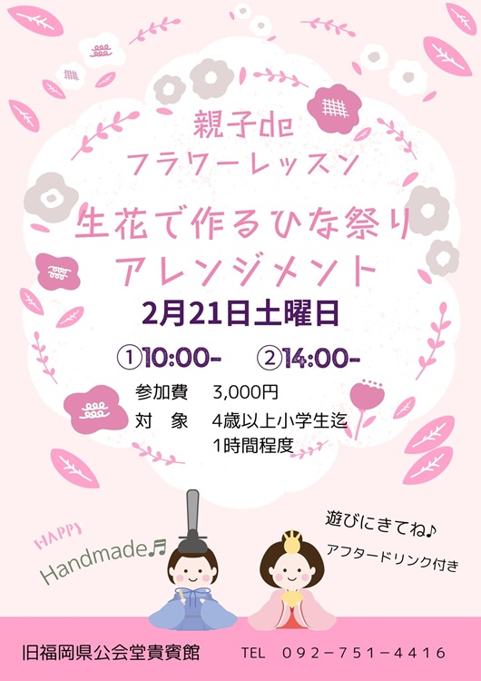 2月21日(土)、福岡市中央区天神の歴史的建造物「旧福岡県公会堂貴賓館」で、春の訪れを感じる『親子deフラワーレッスン 生花で彩るひな祭りアレンジメント』が開催されます。
