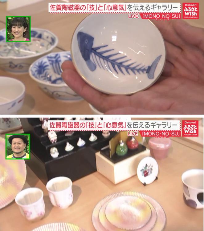 中には、魚を食べ終えた後の骨が描かれたユニークな絵皿や、光を受けてキラキラと輝くピンク色の器など、思わず手に取りたくなるものばかりです。