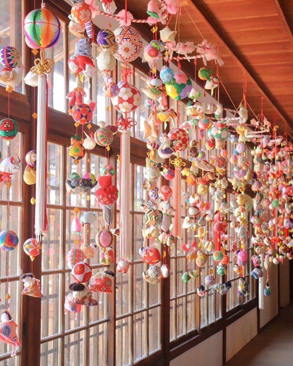 「筑前の小京都」と呼ばれる秋月の町全体がひな人形で彩られます。週末には、長屋門の階段を利用したひな人形の展示が行われ、歴史ある町並みと調和した美しい光景が見どころです。