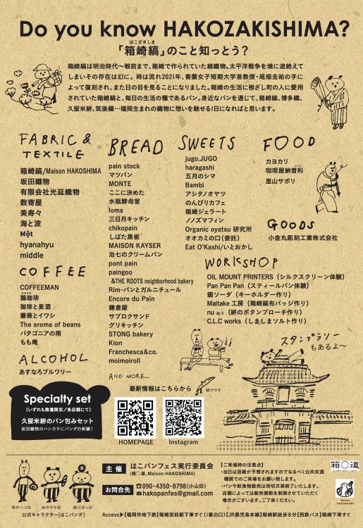 箱崎の有志団体「箱○道(はこまるどう)」と、明治時代から戦前まで箱崎で作られていた綿織物「箱崎縞(はこざきしま)」を復刻させたテキスタイルアパレルメーカー「メゾンはこしま」が共同開催する「織物好き&パン好き」のためのイベント。