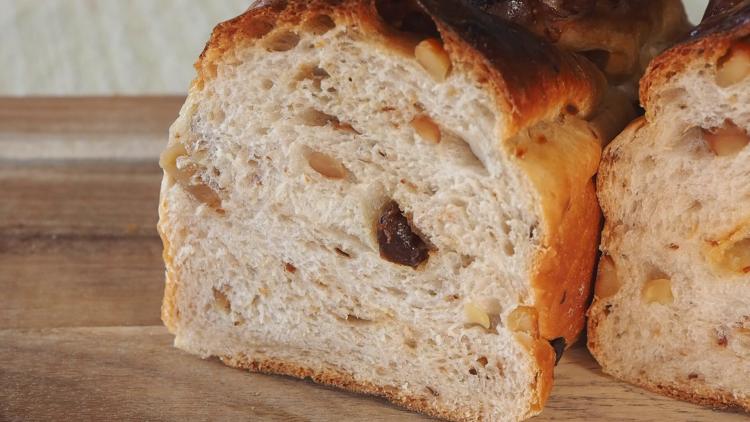 牛乳、ハチミツ、バターを練り込んだ生地に、くるみとレーズンがぎっしり。
