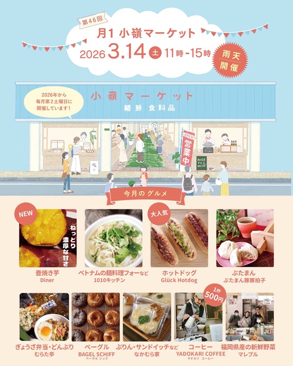 北九州市八幡西区で愛され続けている『月1小嶺マーケット』。3月14日(土)に、第46回が開催されます。3月といえば、卒業や卒園、新生活の準備でパパママも何かとバタバタしがちな時期。そんな忙しい毎日の合間に、地元ならではの温かさに触れて、ちょっと一息ついてみませんか?