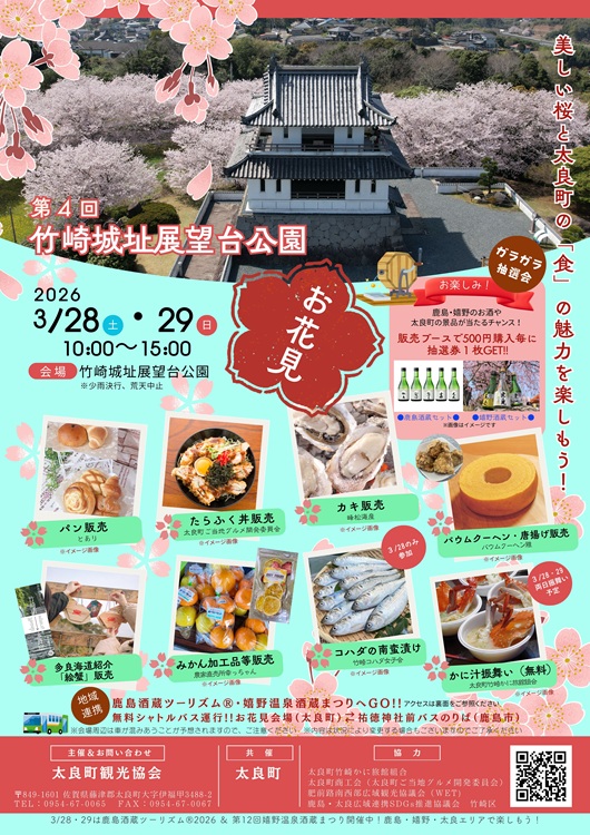 有明海を一望できる絶景スポット、佐賀・太良町の竹崎城址展望台公園で、3月28日(土)・29日(日)の2日間、『第4回 竹崎城址展望台公園お花見』が開催されます。お城を模した展望台を囲むように咲き誇る桜と、青い海のコントラストは圧巻です!