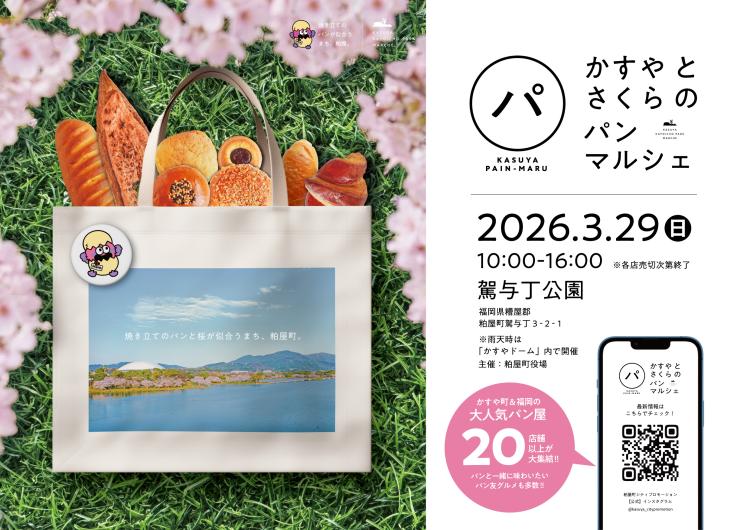 3月29日(日)開催される『かすやとさくらのぱパンマルシェ』では、粕屋町の桜の名所・駕与丁(かよいちょう)公園に、町内外から約20店舗のパン屋さんが大集合。おいしいパン、楽しいステージ、親子で夢中になれるワークショップ等内容盛りだくさん。そしてこのイベントには、「粕屋町をもっと知ってほしい」「もっと好きになってほしい」という想いが込められています。