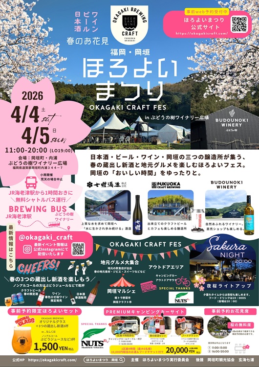 4月4日(土)5日(日)の2日間、福岡県・岡垣町の「ぶどうの樹ワイナリー」で、春のお花見イベント『春のお花見 福岡・岡垣ほろよいまつり OKAGAKI CRAFT FES』が開催されます。