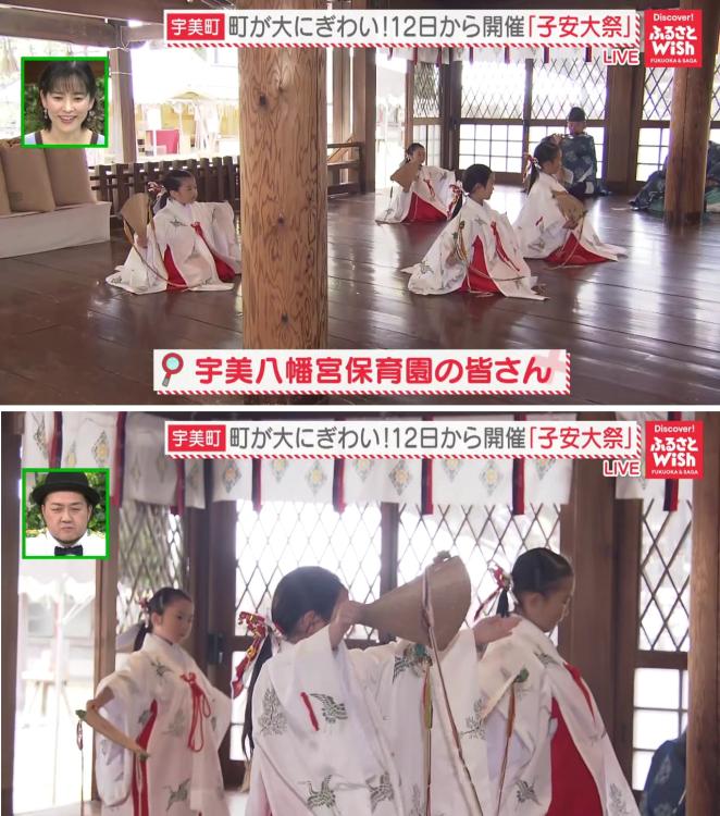 「頓宮」に到着した後、「宇美八幡宮保育園」の年長さん4人が、世界平和を願って作られた「浦安の舞(うらやすのまい)」を披露します。