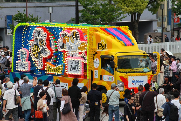 メインイベントは、明治通りを舞台にした「どんたく広場」のパレード。約1.2kmの区間を、個性豊かな「どんたく隊」が次々と行進します色鮮やかな「花自動車」や伝統的な踊りなどが次々と披露されるなか、今年は3日のパレードに大河ドラマ『豊臣兄弟!』に出演中の仲野太賀さんと池松壮亮さん(福岡市出身)が参加することもあり、盛り上がりが期待されます。