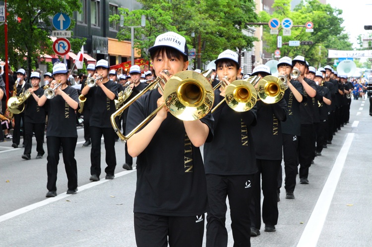 また、パレードの隊列を彩る「マーチング」の演奏は欠かせない見どころの一つ。全国トップレベルの実力を持つ地元の小・中・高校や大学の吹奏楽部に加え、警察、自衛隊の音楽隊が、一糸乱れぬ動きとともに力強い音色を響かせます。福岡市役所前広場に設置される「お祭り本舞台」でも、マーチングのステージパフォーマンスが披露されます。パレードでの堂々とした行進とはまた違う、大舞台ならではの洗練された演奏を間近で楽しめる貴重な機会です。