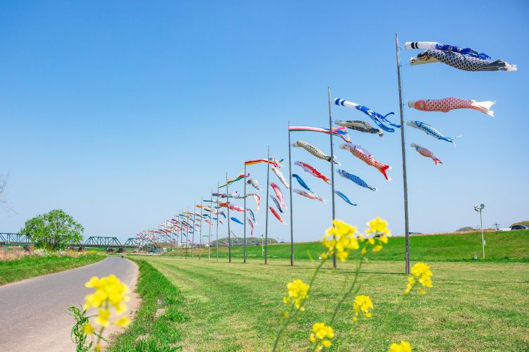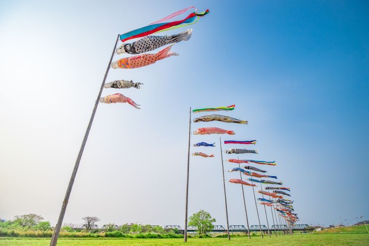 高さ13mの木柱が川沿いに30本並び、250mにもわたってこいのぼりが連なります。広い遠賀川沿いを優々と泳ぐ姿は壮観。近くで見ると迫力がありますよ。