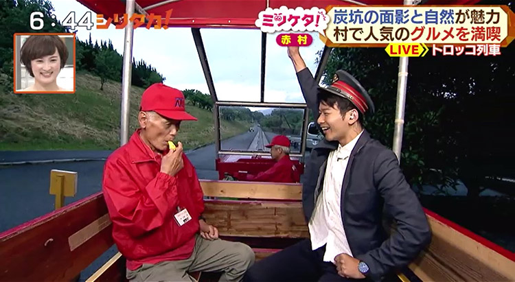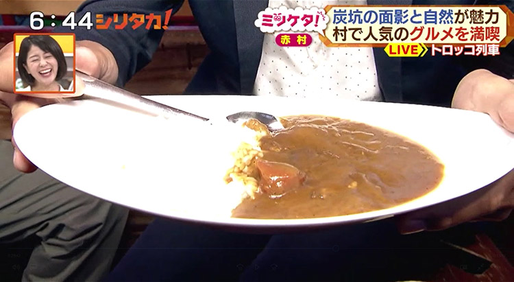 そんなトロッコ列車に乗りながら、なんと今回は赤村の人気グルメを紹介するという一風変わった中継に、スタジオのメンバーも興味津々。まず、カイラが試食したのは、赤村特産物センターで販売されているという「赤村 とことん ばっちゃんカレー」。「おいしい!甘めの味付けですが、後から少しスパイスがピリッときます」とカイラ。実は、このカレー“AKA68”という平均年齢68歳の女性グループが作っているそう。だから、“ばっちゃん”なのですね!上田会長もよく食べられるそうで「うまいよねぇ」とイチオシしてくれました。